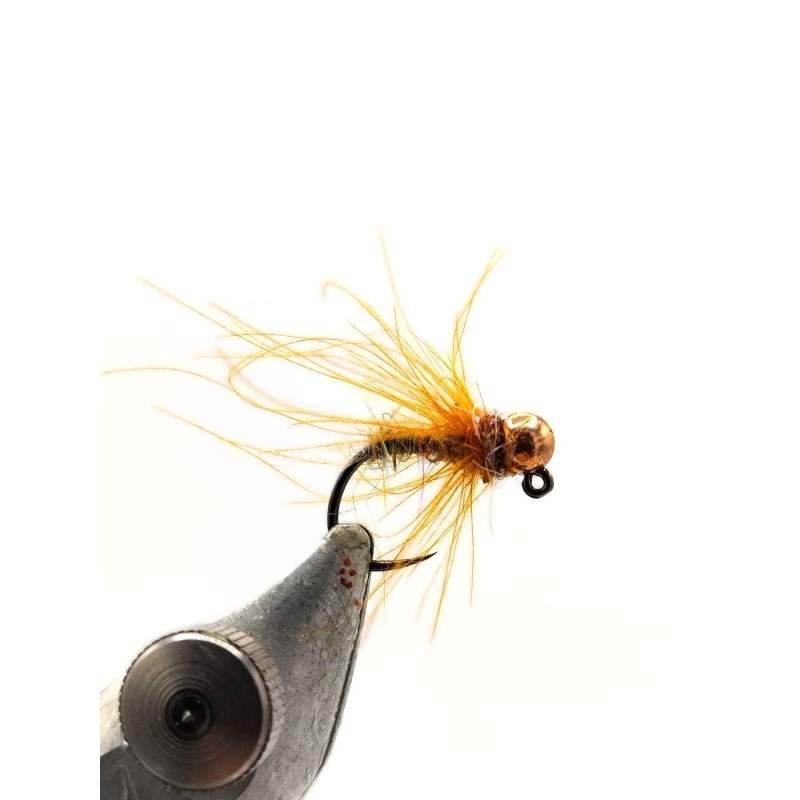 Nymphe de sedge montée sur un hameçon jig à large ouverture et avec une bille tungstène fendue pour aider au basculement de la nymphe sur le fond.