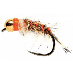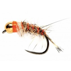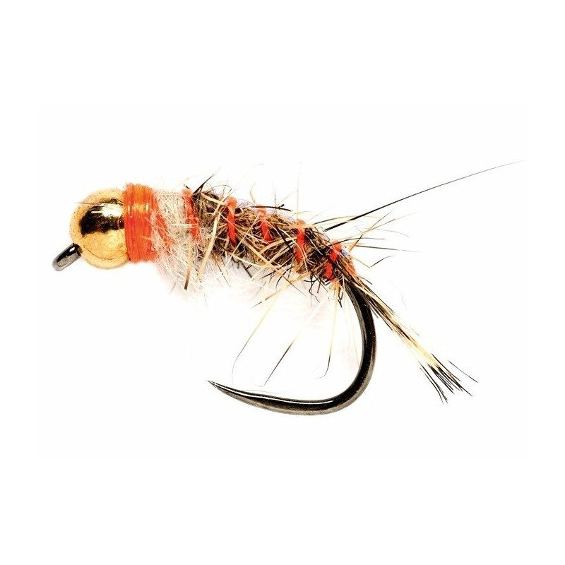 Une oreille de lièvre, montée à la Tchèque, sur un hameçon sans ardillon, avec une bille Or en tungstène, un cerclage orange fluo, thorax blanc brill et orange fluo.
