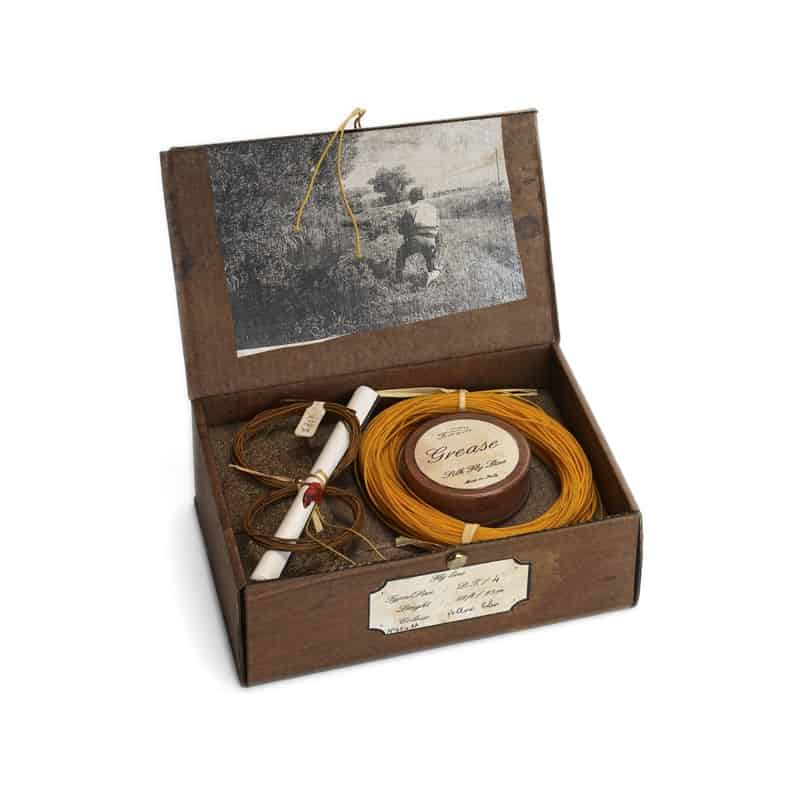 Toutes les soies sont présentées dans un magnifique coffret avec un pot de graisse et deux bas de ligne (1,50m et 2m).en soie naturelle.