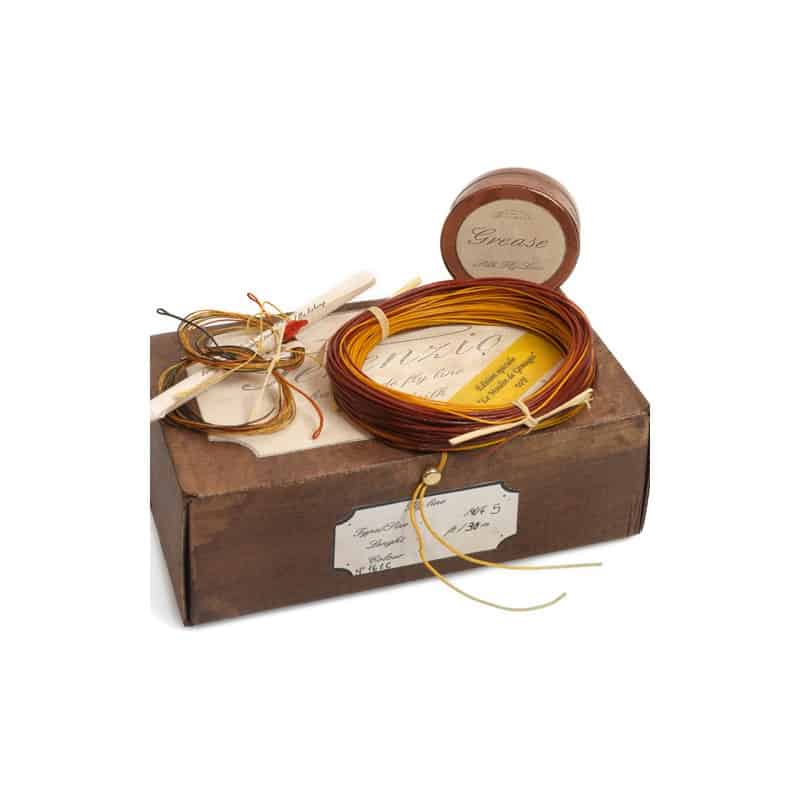 La soie est vendue avec sa graisse et ses deux bas de ligne en soie naturelle (1 de 2m de couleur noir / 1 de 2m avec code de couleur jaune et noir particulièrement adapté aux eaux rapides)