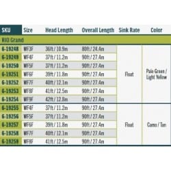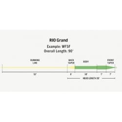 La soie RIO Grand possède un fuseau très court de 11,50 m qui permet de charger très rapidement les cannes rapides. Cette soie est conseillée pour les pêches à grande distance en réservoir et grandes rivières. La tête est très chargée à l'avant pour donner un maximum d'énergie pour lancer des grosses mouches et contre le vent.