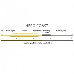 Hero Coast 95 est une gamme de soie puissante et facile à lancer pour la pêche côtière. La tête SLOMO mesure 9,5 mètres de long avec une conicité douce et facile à utiliser, idéale pour les débutants et les pêcheurs expérimentés. La tête est un peu surchargée pour faciliter le lancer de la mouche pour les débutants et pour donner un peu plus de puissance aux lanceurs expérimentés. La section de la tête est d'aspect furtif, olive, ce qui donne un contraste agréable avec le running foncé. Les boucles soudées aux deux extrémités permettent d'attacher rapidement et facilement le backing et le leader.