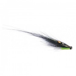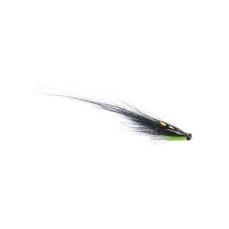 Tube fly léger, monté sur un tube plastique avec une longue aile noir et un corps chartreuse et un substitut de jungle cock artificiel.